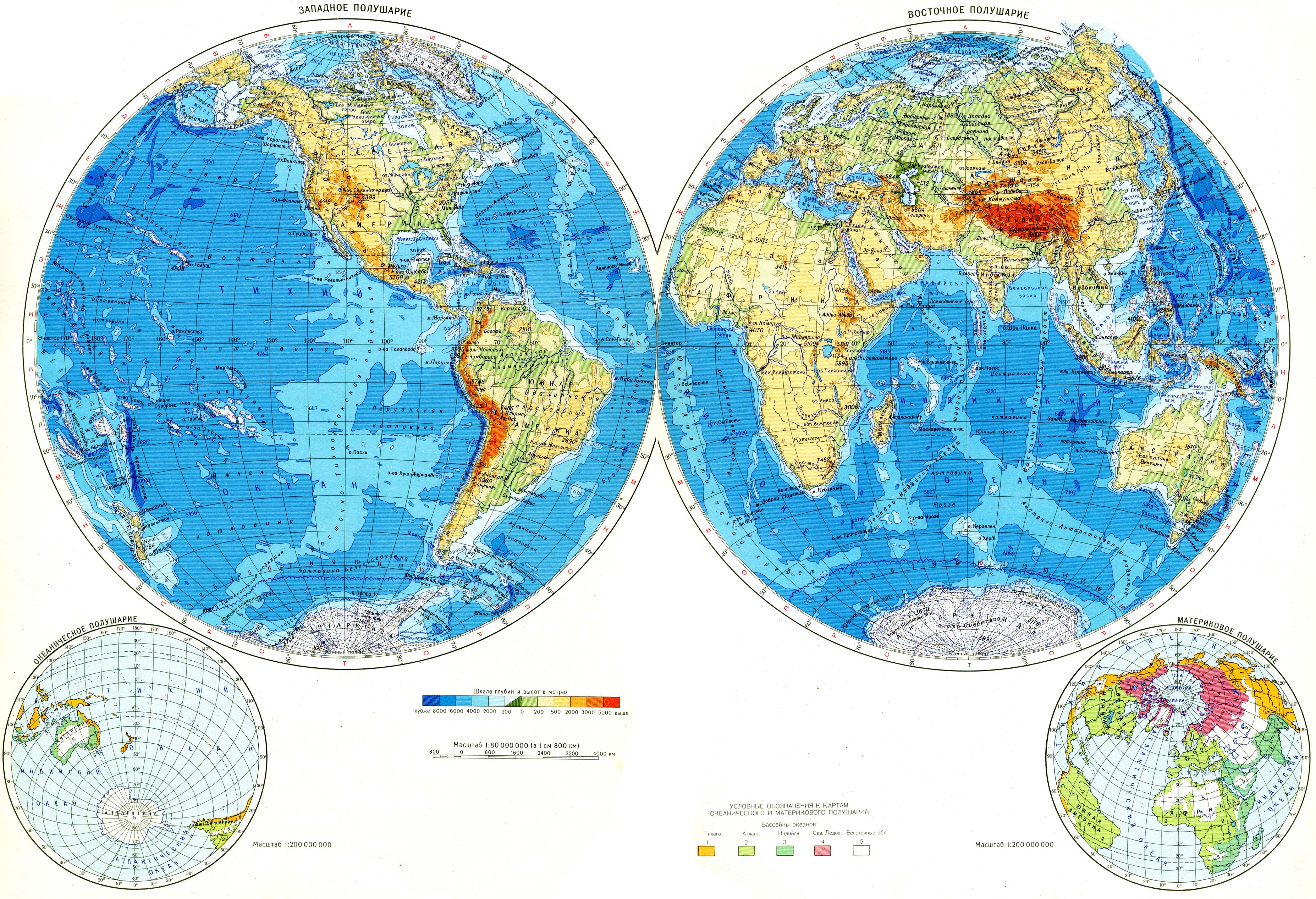 Физическая карта полушарий крупным планом на русском языке открывается в новом окне на весь экран.
