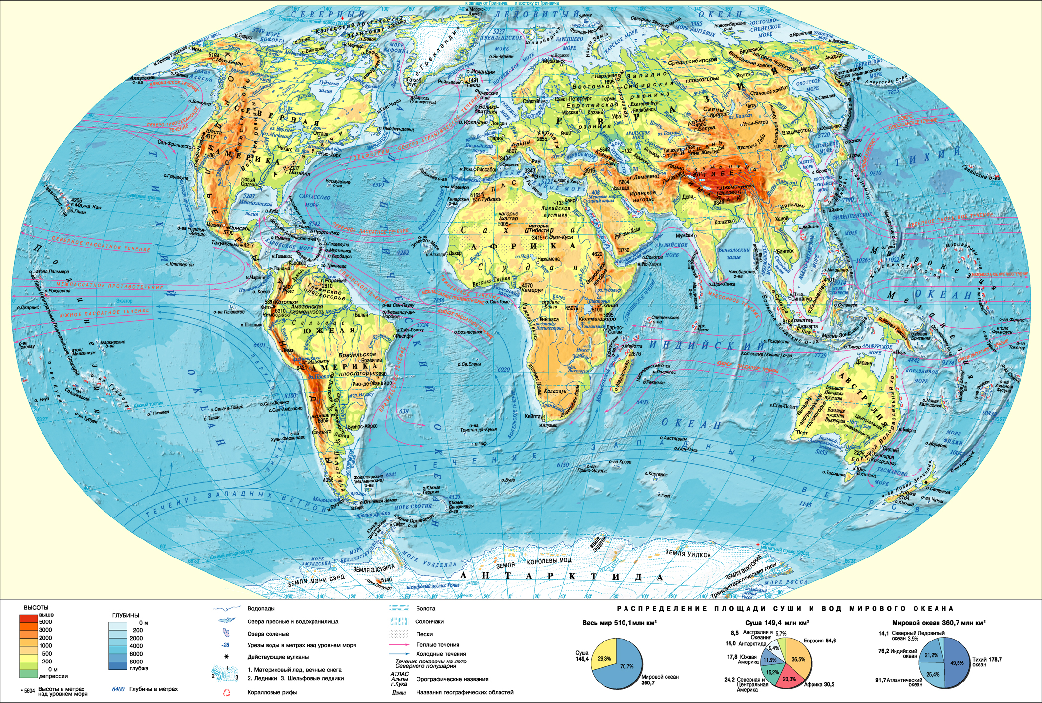 Географическая карта мира с координатами широты и долготы, с указанием течений мировых океанов крупным планом: