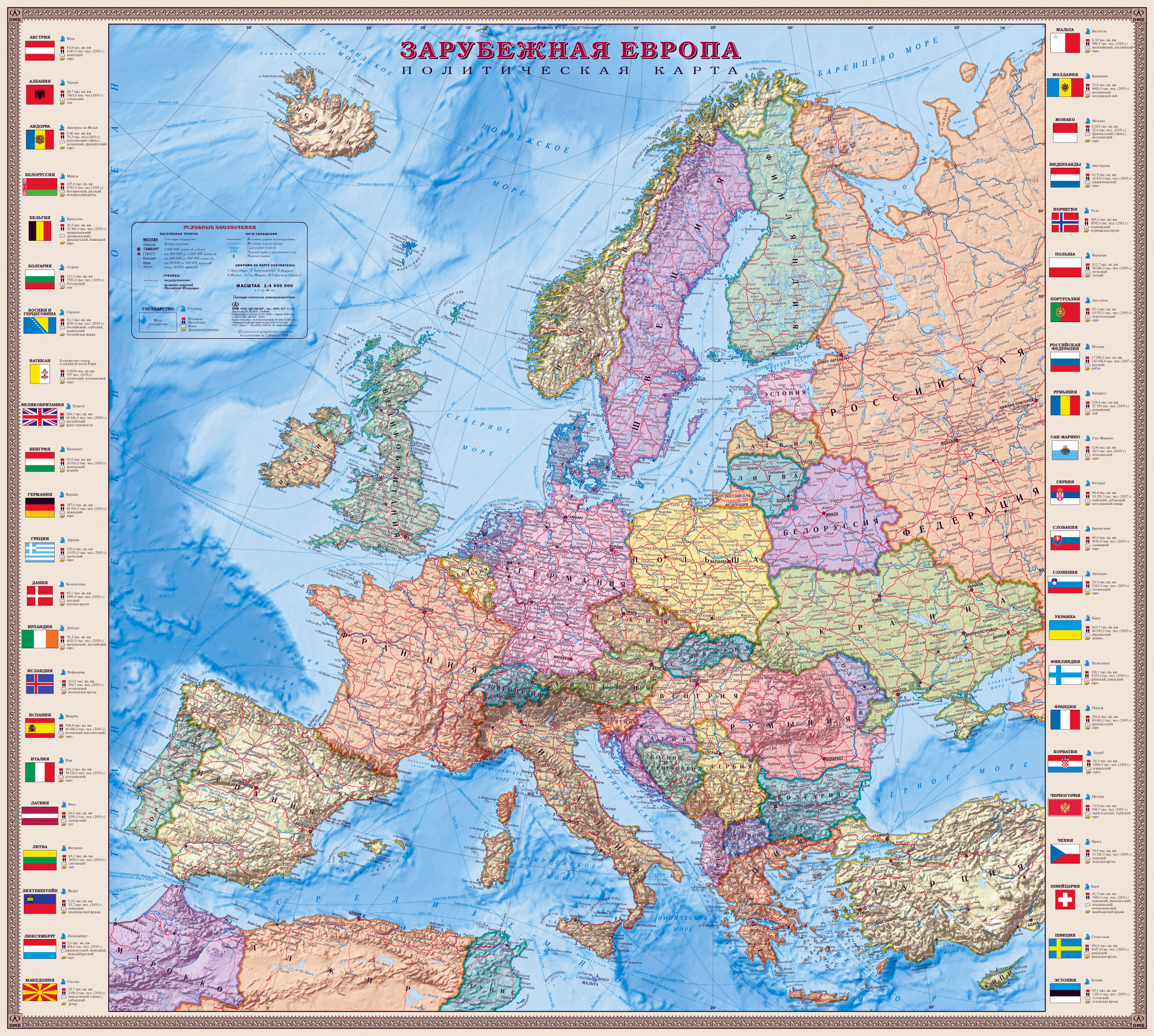 На политической карте Зарубежной Европы показаны страны, столицы и крупные города, границы государств Зарубежной Европы